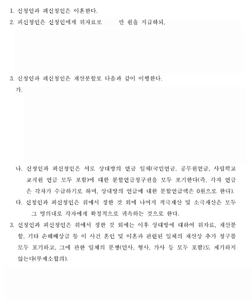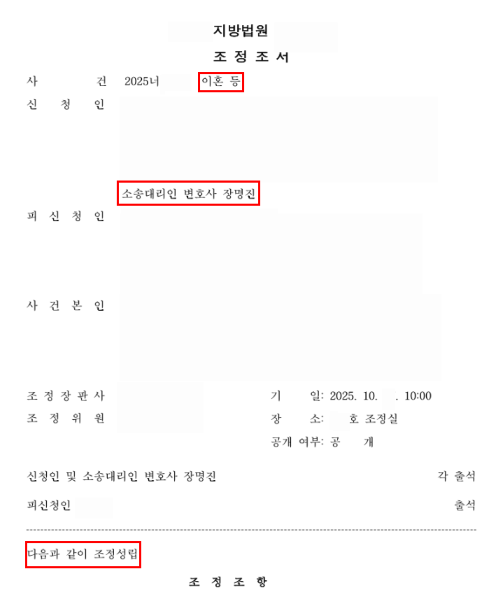 위자료 및 재산분할금 지급받는 것으로 조정신청 취지대로 조정 성공.