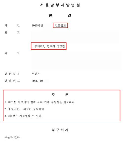 부동산 인도청구하였고, 임대인인 우리 의뢰인의 피해가 커질 것이 우려되어 빠른 판결이 필요함을 말씀드림. 빠르게 무변론 판결 받음.