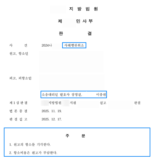우리 의뢰인, 억울하게 사해행위취소 청구 당하신 후 이솔 법률사무소에 의뢰하셔서 1심 전부승소하심.