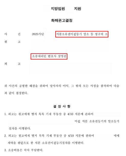 우리 의뢰인, 부동산 지분 공유자와 공유하기로 한 비율대로 등기가 되지 않았음을 발견하고 등기부 정정을 위하여 상담 요청하셨고 등기부 정정을 위하여서는 소송이 필수적임을 설명드리고 소송 수행.