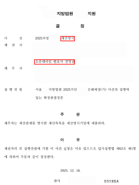 재산명시 인용 결정.
