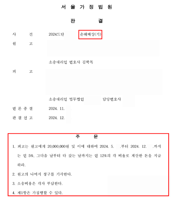가정법원에서 2천만원 인용 판결. 의뢰인은 현재 이자까지 판결원리금 모두 실제 수령한 상태.