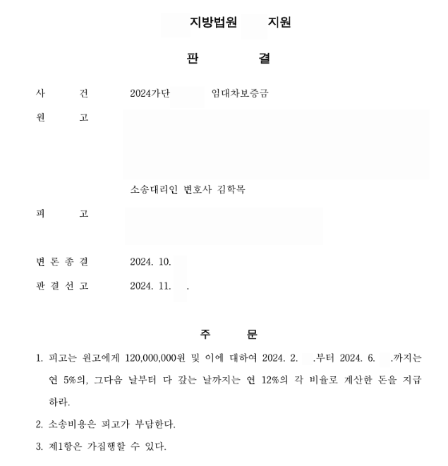 이미 목적물이 선인도된 상태이므로, 임차 목적물에 직접 거주하며 소송을 하게 되는 많은 경우와 달리 법정이자와 소촉법상의 지연손해금을 모두 청구하였음. 미리 파악해본 바 임대인의 다른 멀쩡한 재산이 있음을 확인하고 그 재산(부동산)에 대한 가압류를 진행했음. 특이사항으로 임대인이 직접 변론기일에 출석하여 자신의 상황을 피력하였으나 당연히 받아들여지지 않았음.
