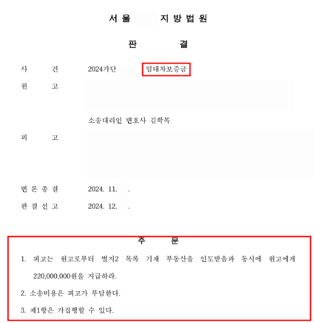 별건으로 인용된 의사표시의 공시송달 명령이 있었음. 이후 요건 사실을 더 보완하여 임대차보증금반환청구 진행함.