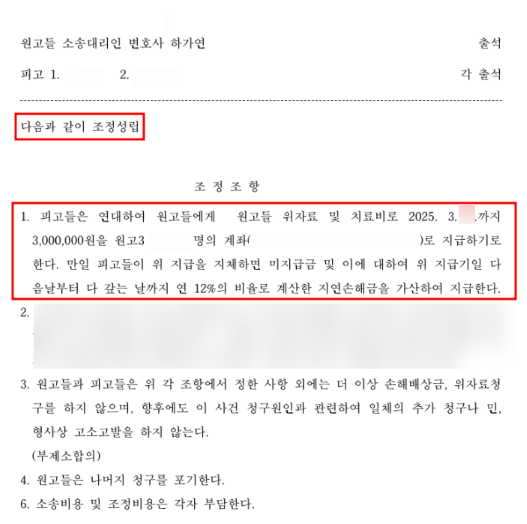 치료비와 위자료를 합한 금액 300만원을 지급받고 조정기일 단 1회에만에 조정 성립.