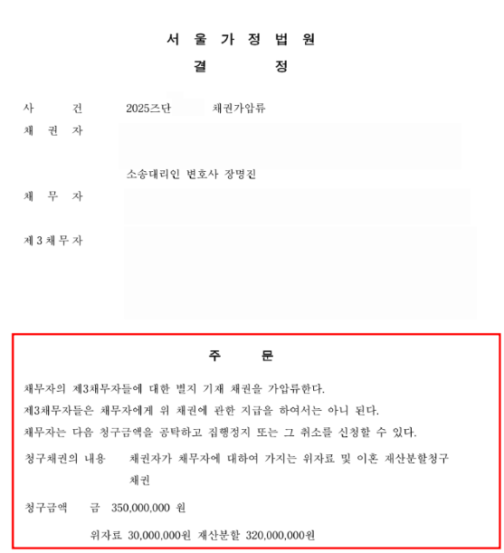 상대방 배우자 명의로 전세보증금이 있었기에, 일단 부부의 가장 큰 재산인 위 재산에 대한 재산분할청구권을 보전하고자 채권가압류신청에 이름.