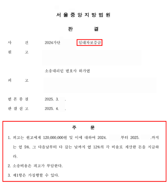 임대차보증금 1억 2천만원 및 그에 대한 이자와 지연손해금 포함한 전부승소 판결.
