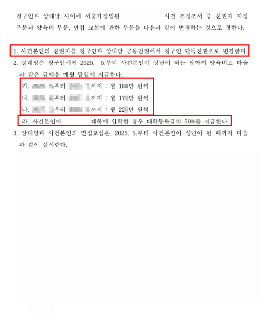 현재 공동친권으로 되어있어 아이에 대한 경제적/신분적 부분에서 양육자가 포괄적인 권한을 가지고 결정할 수 없는 것이 비효율적인 일임을 재판부에 밝히고, 아이에게 현재 들어가는 양육비, 비양육자인 상대방의 경제적, 사회적 능력을 모두 피력하여 조정 성립