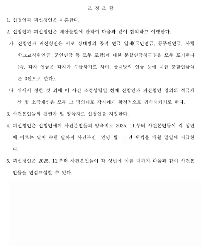우리 의뢰인이 배우자와의 이혼을 강력히 희망하는 상태이고, 이미 혼인파탄에 이른 점, 부부의 가장 큰 재산은 처분하여 이미 두 분이 나눠가지신 점 등을 신청서에 작성하고, 따로 위자료나 재산분할금 주고받는 것 없이 각자 명의 재산 각자에게 귀속하며 이혼하여야 함을 주장함.