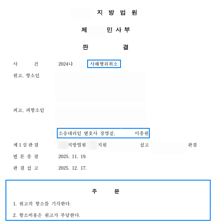 우리 의뢰인, 억울하게 사해행위취소 청구 당하신 후 이솔 법률사무소에 의뢰하셔서 1심 전부승소하심.