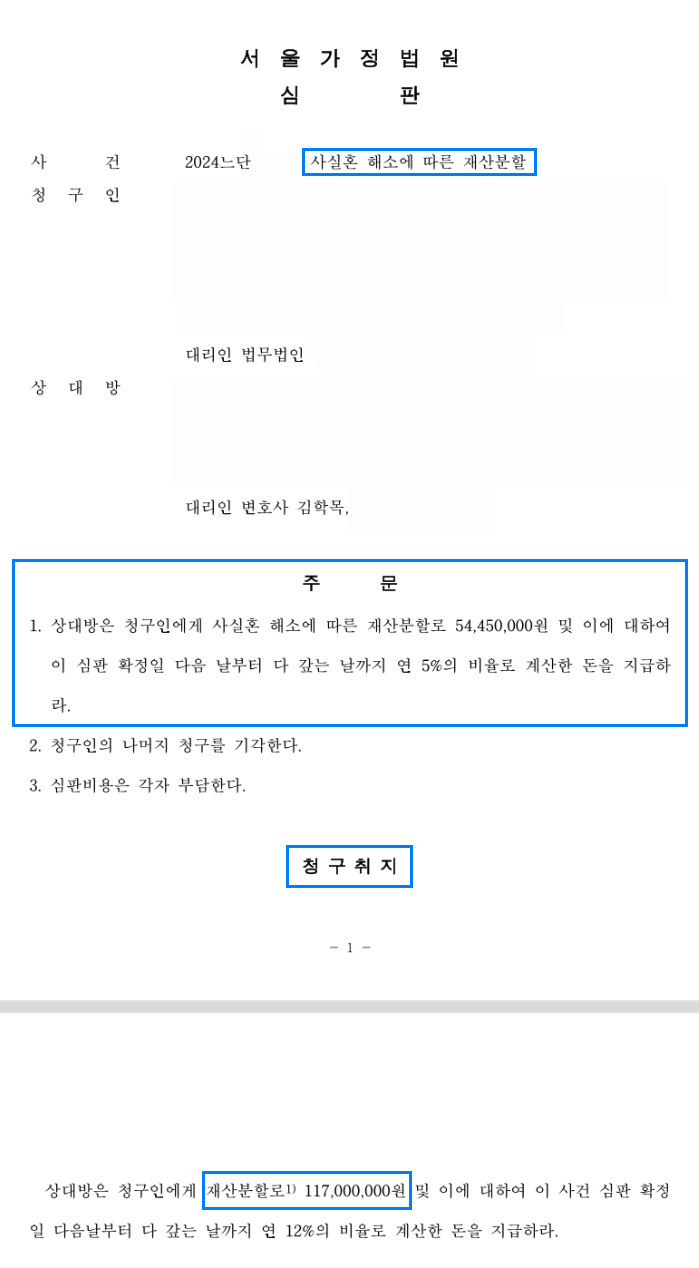 어느 정도 분할할 것이 있다는 것은 인정하는 상태였지만, 청구인이 청구하는 금액은 그 액수가 매우 과다하였음. 이에 이솔에서는 재산분할에 대한 기여도를 입증하기 위하여 많은 노력을 기울임. 중간에 조정 회부 되었었지만 조정에 이르지는 못했고 청구인이 청구한 금액의 절반 정도에 해당하는 분할금을 지급하라는 심판문 수령함.