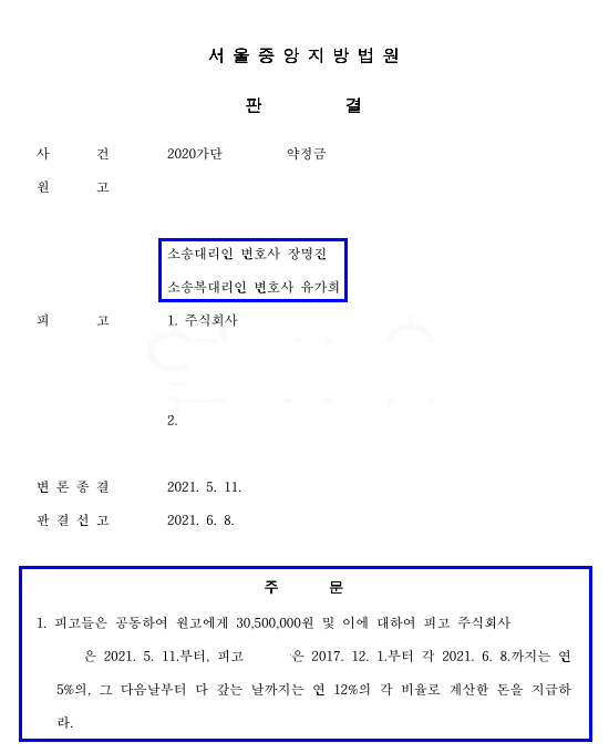 결국 의뢰인은 회사와, 회사의 공동대표이사중 1인에 대하여 그들이 '공동하여' 금원을 지급하라는 승소판결을 받게 되었습니다.