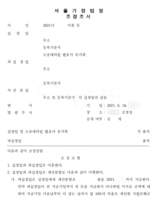오늘은 얼마전 원만히 성립된 이혼 조정 사안을 소개합니다.