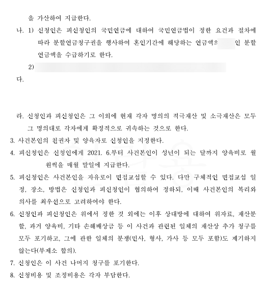 원만히 조정 성립된 이혼 조정조서 중 일부(개인정보 등 모두 삭제)