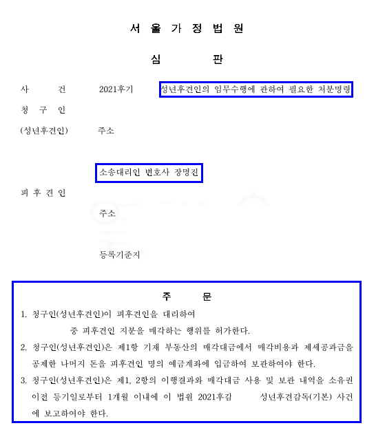 물론, 심판문에서 보는바와 같이 허가 결정이라도 매각대금을 피후견인 계좌에 보관하는 것과 매각 후 성년후견 감독 사건에 이를 보고 하여야 한다는 조건을 꼭 지켜야 하는 것이며 이는 저희 이솔에서 의뢰인이 이해하실 수 있도록 정확히 설명하여 드렸습니다.