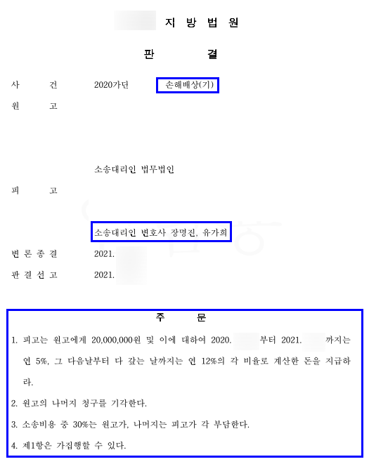 손해배상금액은 원고가 청구한 금액에서 1천5백만원 줄어든 2천만원으로 감액되었으며 소송비용 또한 피고가 전액부담하지는 않게 되었습니다.