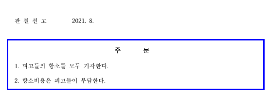 피고들의 항소가 기각된 2심 판결문 주문. (개인정보 등 핵심내용 모두 삭제)