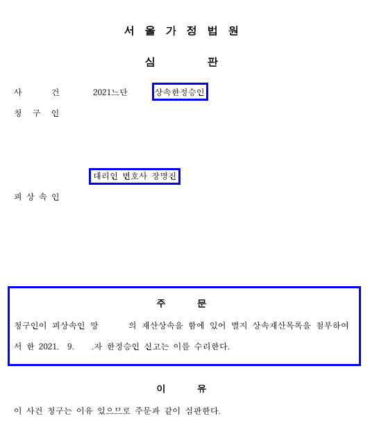 절차가 다 끝나면 많이들 안도하시곤 합니다. 한정승인 심판문은 간단히 아래와 같은 형태로 나오게 됩니다.