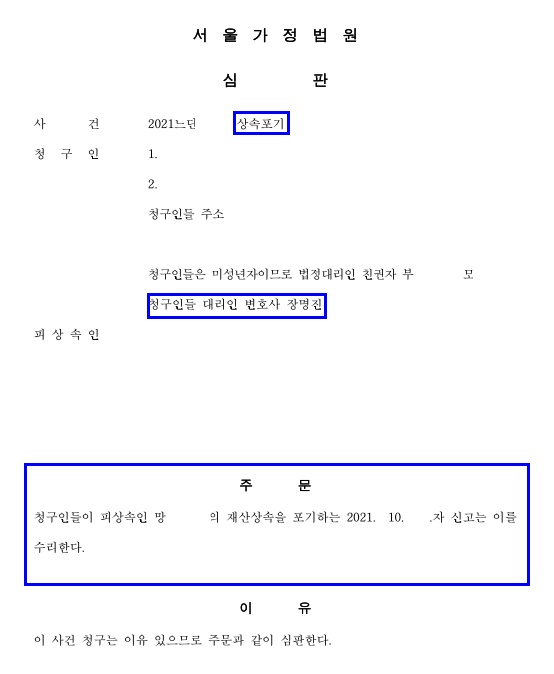 미성년자 상속포기 케이스는 아래에 심판문을 하나 보여드릴게요.