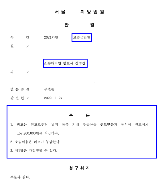 결국 무변론승소판결을 빠른 시일 내에 받아낼 수 있었고, 앞으로 실질적인 보증금 반환을 위하여 강제집행 등을 계획하고 있습니다.